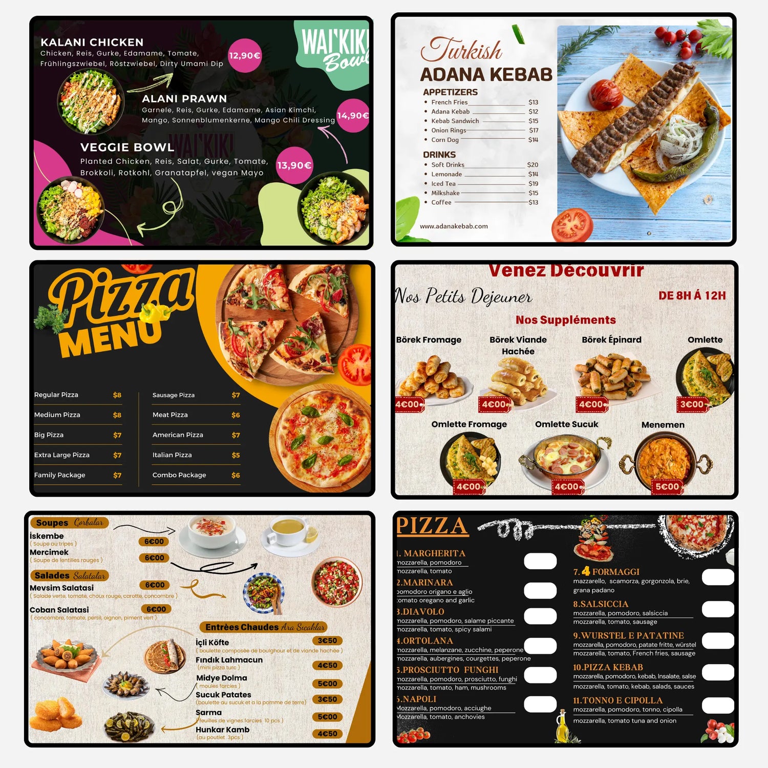 Bu hizmet ile sadece standart bir menü değil, işletmenizin tarzına ve ihtiyaçlarına özel olarak tasarlanmış bir menüye sahip olacaksınız. Tasarımcılarımız, mağazanızın dekorasyonuna uyumlu, müşterilerinizin dikkatini çekecek görseller ve düzenlemelerle size danışmanlık yaparak çalışır. Menülerinizi tam anlamıyla işletmenize özel hale getirmek için isteklerinizi dinler ve tasarım sürecinde sizi bilgilendiririz. Böylece, menünüz hem görsel olarak çarpıcı olur hem de marka imajınıza en uygun şekilde hazırlanır.